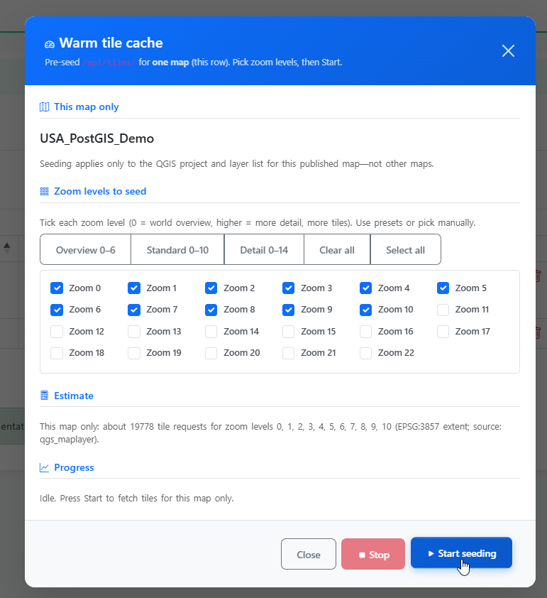 - Seed Cache Feature – Pre-generate tiles by zoom level and extent to dramatically improve initial map rendering and scalability